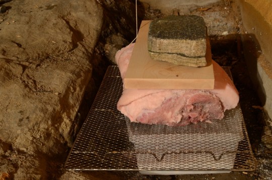 At this point, I’m realizing why there are few definitive recipes out there for curing pork, as there are basically three ingredients: pork, salt, and cool temperatures. Feel free to crack another beer, cause this ain’t no soufflé. After salting, I placed the leg on a cooling rack, skin side up over a plastic container to catch the liquids. I slightly elevated the hoof end and placed weights (carefully selected rocks from the edge of the driveway) to aid in drainage. Every day for a week I placed fresh ice cubes in the plastic container and set a few ice packs around the leg to help keep it cool. I don’t know if this was necessary but I really didn’t want the meat to spoil on my first attempt. Next time, I wouldn’t bother with the weights because I don’t think they push out much more liquid. And if I was going to ice the dripping container again I would place the leg skin side down, as the evaporating ice seemed to dissolve the salt on the fleshy side. I sprinkled a little extra salt everyday to counteract that. The temperature in the crawl space seemed to hover in the mid forties, and I’ve seen no sign of spoiling. I don’t know what kind of results you could achieve by trying this in a regular refrigerator, as I’ve read varying reports on ideal humidity. If you have a wine fridge where you can control temperature and humidity that would be ideal. Although people with a fancy ass wine fridge probably aren’t hanging 25lbs of blood dripping pork for 12 months next to their vintage Bordeaux.