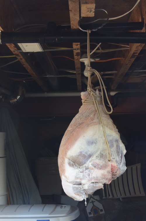 After salting the leg, making sure to rub it in to every crevice, I took the leg down to the crawl space where I will leave it to mature. Typically, you would get your leg in the fall, when you would be guaranteed of cool weather to come. Thankfully for us the weather is becoming seasonably cool again so I don’t have to worry about the leg spoiling before the air warms.