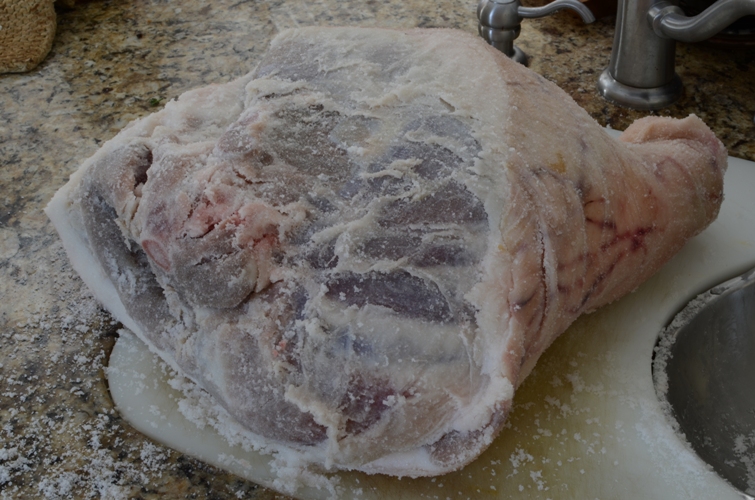 I left the leg like this for a week, emptying the container (dogs new favourite water bowl) of drippings and adding ice every morning. After a weeks time I removed the salt from the leg using a damp cloth. Then I resalted with fresh salt and tied a nylon rope around the hoof end of the leg.