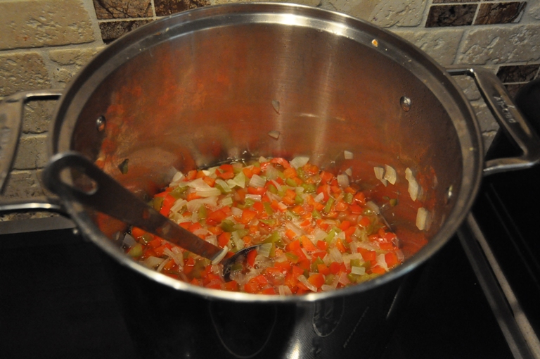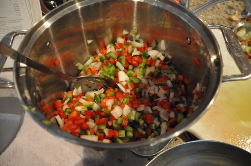 Most of the time is spent prepping the food. Chopping the red and green peppers. This process I find so relaxing…you just get into a rhythm of cutthing while listening to music.