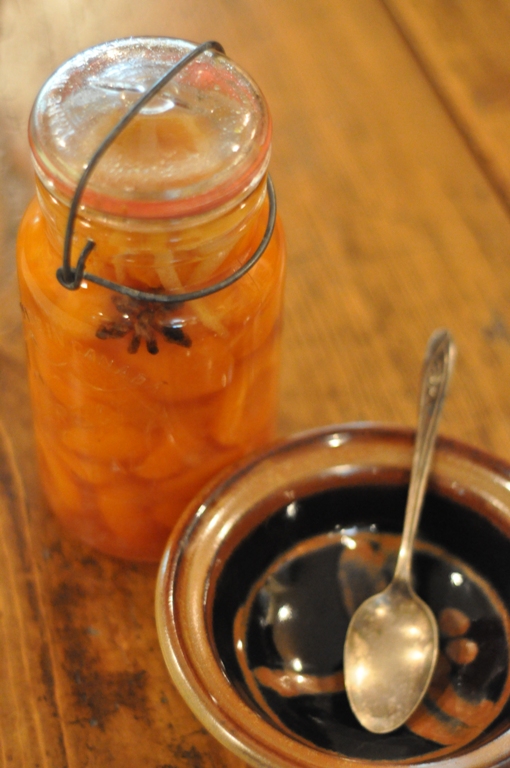 While tending to my store/art studio Thyme of the Season I decided I would get a head start on some additional preserving that I wanted to do. We had purchased some very nice looking Ontario apricots at the veggie store and I wanted to use the left over pear pickling sauce to preserve them…nothing goes to waste around here.