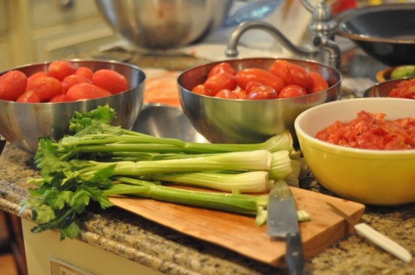 After all of the tomatoes have been prepared we move on to all of our other ingredients which include chopped celery, onion, and zucchini. You can substitute green pepper for the zucchini.