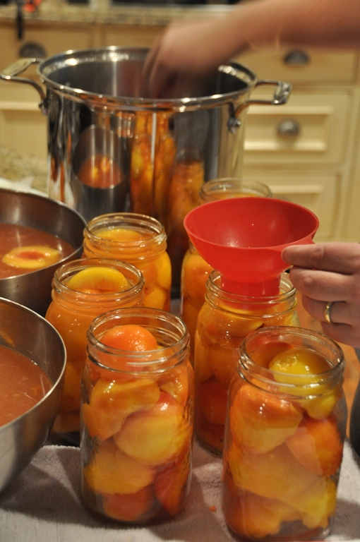 7. Placing the peach with its’ pit ~ pit side down pack each jar until full leaving 1/2″ headspace.  Remember peaches will float up so pack the jars as tightly as you can without damaging or bruising fruit.