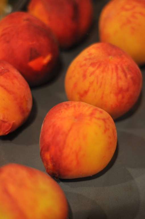 4. Place the peaches on a cookie sheet.  We found that it is better to put them on a cookie sheet than in a bowl because they continue to cook in  a bowl as you pile one on top of the other.