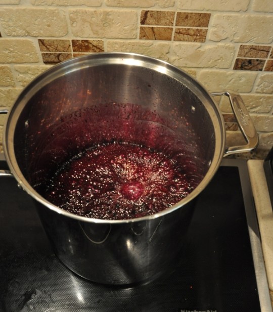 A lot of work goes into this jam. I have spent over 15 hours stemming these little beauties. We were so successful foraging yesterday I don’t think we realized at the time just how many berries we had collected. I have stemmed 36 cups of berries…my hands are stained burgundy with their juice but boy is the jam worth it!