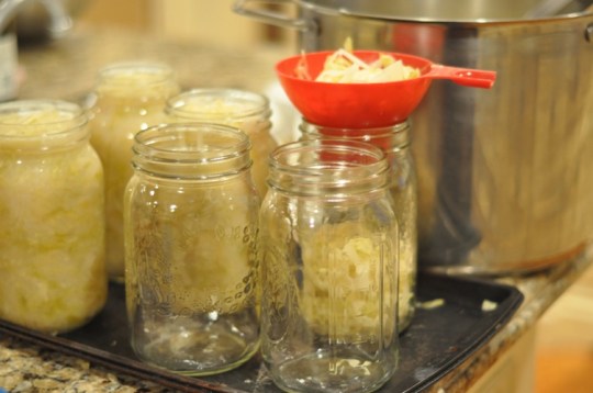 2. Pack sauerkraut, with brine, into hot sterilized jars, leaving 1/2″ headspace (we sterilize our jars in the oven for 30 minutes at 250F).  Remove air bubbles and adjust headspace, if necessary, by adding more brine.