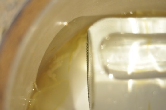 2. In a large stainless steel saucepan, bring sauerkraut, with brine, to a simmer over medium-high heat.  Do not boil.  With 15-25 lbs of cabbage this will probably have to be done in batches.  Note: this is where sterilizing your jars in the oven will help free up an element on your stove so you can heat two batches at once and it will keep your jars hot.