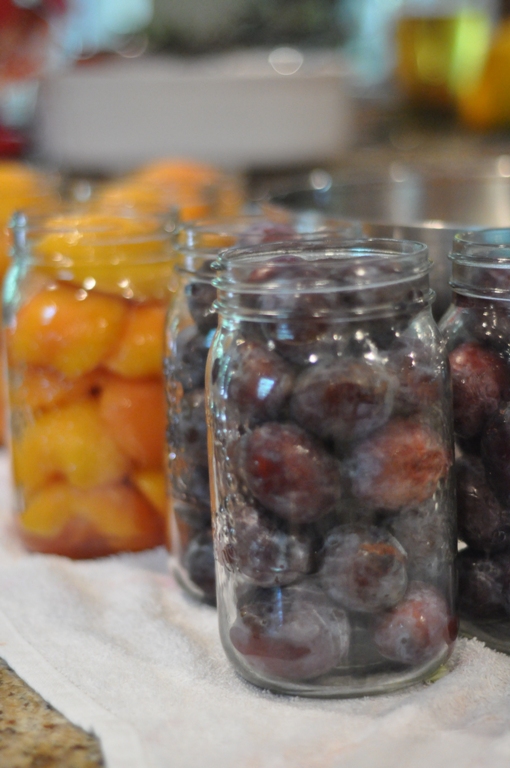 While doing the peaches in light syrup we did 2 x 3 litre baskets of plums…even easier to do than peaches? Yes, all you have to do with the plums is wash them, prick them with a fork in several places, pack in hot sterilized jars, laddle hot syrup into jars, seal and process for 10 minutes…oh, and don’t forget to add the rum ~ 1 tbsp per 1 litre jar.