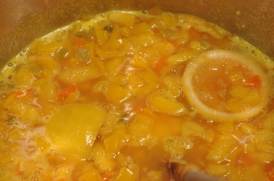 - In a stainless steel saucepan bring peaches, peppers, lemons and vinegar to boil over medium high heat. Reduce heat and boil gently uncovered for 35-40 minutes or until soft.