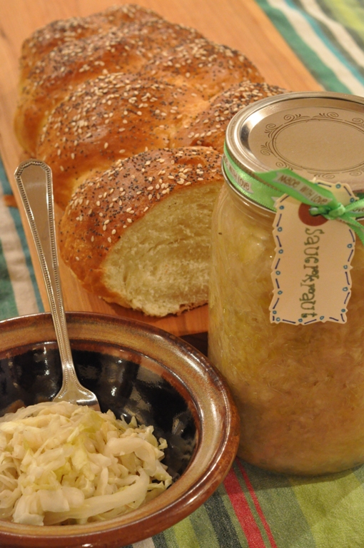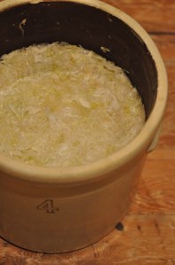 Five weeks today and we jarred our first batch of sauerkraut. The whole process of natural fermentation is still kind of a mystery to me but the proof is in the “kraut.” It is so good…I know my days of buying store-bought sauerkraut are over. It was really quite easy. All we did was cut up 8-10 heads of cabbage, place them in an old, clean, crock with the directed amount of salt, a plate and some jars of water on top to pack it down, and then we stored the crock at about 70F or room temperature. Two important NOTES: (1) make sure you skim off the scum everyday and (2) do not let the temperature drop too much. If the temperature drops and the room becomes too cool then the liquid disappears. Again, I am not going to think about the science behind it all; however, once we moved it into a warmer room the liquid reappeared overnight. We won’t make that mistake again…consistency is everything. I do know that I enjoyed skimming the scum off most days because I could sample the product and it got better as time went by. Once the bubbles stop forming the fermentation process is over and it is time to jar it.