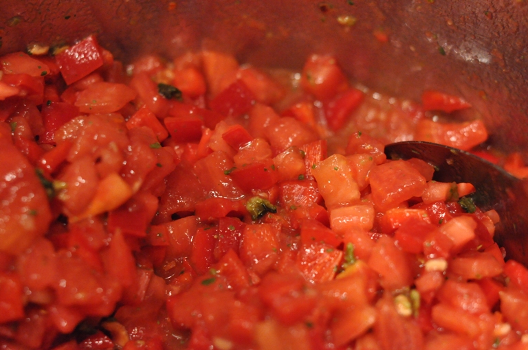 - Wash, seed and coarsely chop tomatoes and peppers; drain off excess liquid.