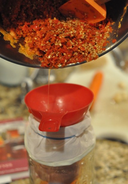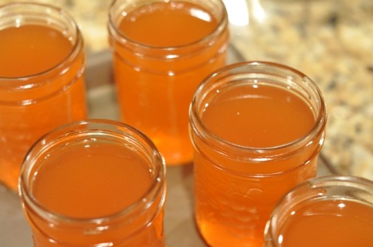 5. Ladle hot rose hip syrup into hot sterilized jars, leaving 1/2″ headspace.