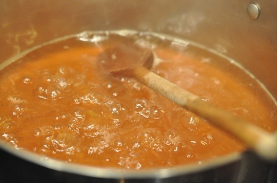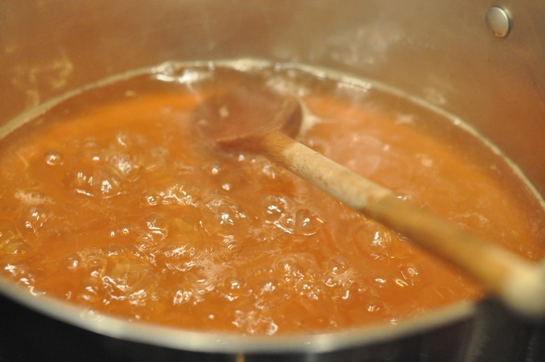 4. The next day, discard rosehip pulp.  Combine both lots of collected juice and measure (you should have about 1 litre).  Pour the rosehip juice into a stainless steel saucepan, add the sugar and heat, stirring until dissolved.  Bring to a boil for 2-5 minutes.