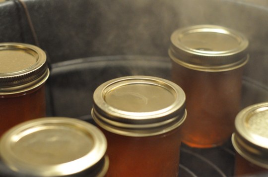 7. Place jars in canner, ensuring they are completely covered with water.  Bring to a rolling boil and process for 20 minutes.  Remove canner lid.