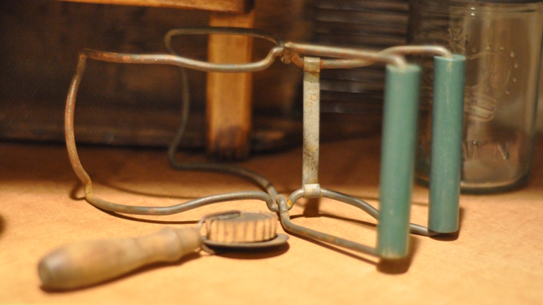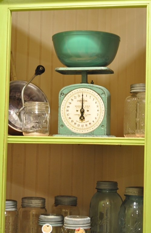 As we finish up the back wall of our cold room pantry/canning storage shelves we’ve enjoyed accessorizing the corner cabinets with some vintage jars, antique berry pickers, old kitchen scales, and a few other odds and sods. Each piece is unique in its’ own way. I really like this little pie crimper…different eh!?!