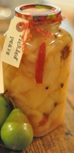 they will once again find their way back into our kitchen. There is nothing like filling a vintage jar with some bright fruit and placing it just right onto your shelf. All of the different sizes and styles of jars make your shelves that much more interesting. And, there is nothing like repurposing. A friend of mine kindly traded me some old jars this summer and after spending a pleasant afternoon with Matt and my mom washing them all we were thrilled to find that several of them would work with the new rings. The pickled pears look really beautiful in this old jar; the shape of it is so interesting and it sealed just fine. When filling these old jars it is best to make sure that they are really hot going into the water bath as I have had some break. This problem can be corrected by ensuring that the jars are really hot when they are filled and that the water bath was NOT at a full rolling boil when they enter. This way it is not such a shock to the older glass.