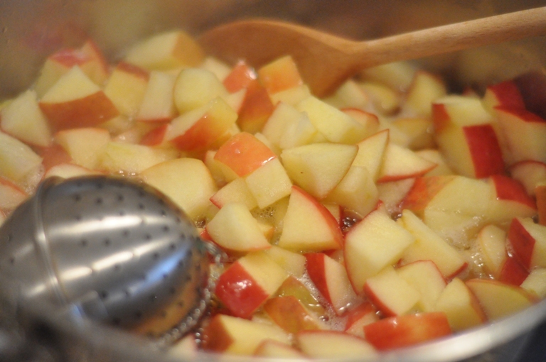 - Bring to a boil over high heat, then lower the heat and simmer. Stir gently to prevent apples from sticking and breaking apart. Cook until the apples become translucent and the syrup thick, about 45 minutes. Remove the spice ball and discard the its’ contents.