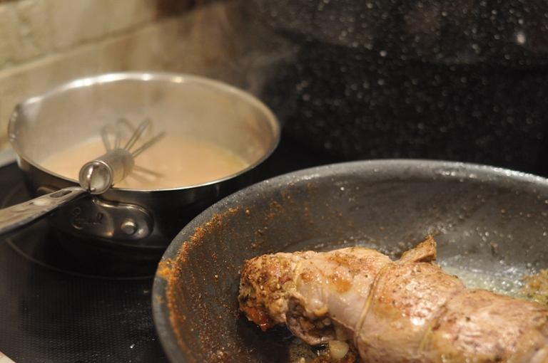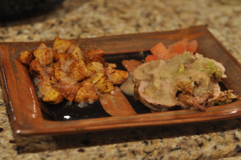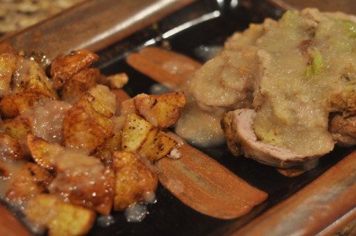 Tonight…APPLES!  Matt is making a pork tenderloin stuffed with fresh celery and onions and dressed with everything APPLES.  Matt first cooks the pork in the oven which releases its tasty juices that Matt adds to some Spartan Apple Sauce to make a sauce for both the meat and fresh garden potatoes.