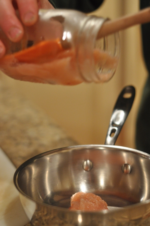 Then, he browns the meat in a skillet while reducing and thickening the apple sauce topping.  Watching Matt cook is the most relaxing and wonderful sight.  It is like listening to your favorite music.  He spoons a little taste of this and that into his mouth and then adds a sprinkle of salt here and a dash of this there.  I love it.  Until I started canning I never really appreciated the joy of watching someone in the kitchen enjoying making a tasty meal.  Now, I can watch in amazement as he turns our canned preserved into a delicious meal.