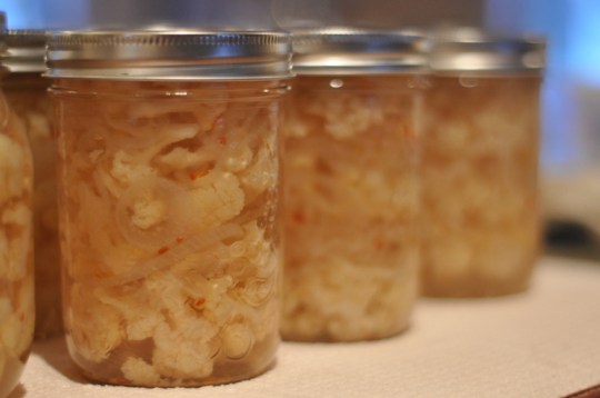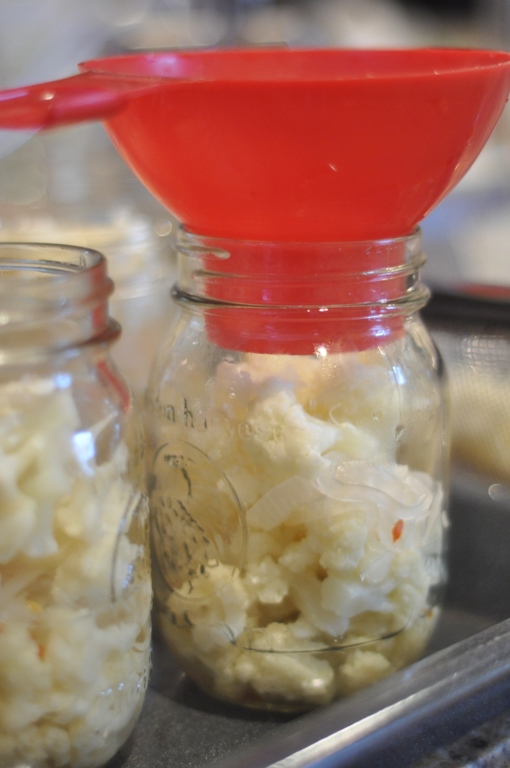 5. Working quickly, gently pack the cauliflower and the onions into hot sterilized jars.  The cooked cauliflower florets should be packed careful so they retain their shape.