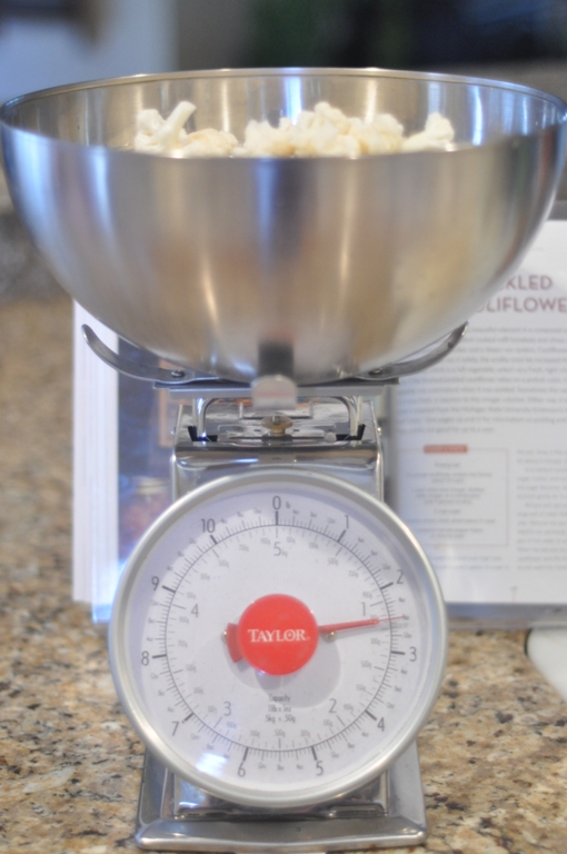 I used three beautiful crisp white heads of Ontario cauliflower, purchased at our local veggie shop, Muskoka Veggez.  It totalled 7 1/2 which is three batches.  I required all of the pickling liquid the recipe called for but my yield was short by 6 pints or 6 x 500mL…which is a lot.  I am really not sure why I was short because I weighed all of the cauliflower but I am happy with the end result and look forward to sampling these little florets.  I may even do another batch or two.