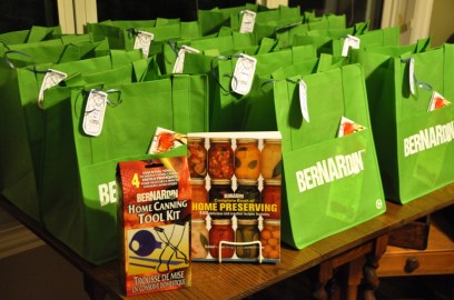 I explained to everyone that at the end of the evening there was going to be a little contest to win some great prizes that were kindly donated by Bernardin.  The contest winners would have their choice of the Bernardin Canning Kit or the Bernardin Complete Book of Home Preserving.  But, “don’t worry guys…you are all canners and thus, all winners”  so everyone goes home with a reusable Bernardin bag and their Home Guide to Preserving.  Big Thanks to Bernardin!