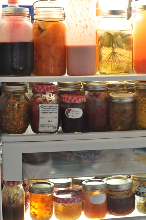 Some of the jars in the fridge were processed in a hot water bath. All of the soups and veggies (without vinegar/sugar or the low acid foods with a pH level 4.6 or higher) were processed in a pressure canner. Some of the jars…like the dilled green tomatoes were just cut up and placed in left-over pickle brine. After about 3 weeks, they taste like dill pickles and will last in the fridge for while. And, the ones with the screw tops were processed in the hot water bath or are samples of the jams and jellies we make (left over from larger batches). Hope this helps.