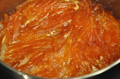 There really isn’t much syrup left over from the final boiling of the peels…and it really isn’t syrup…it is more set up then you’d imagine. In fact, we left a batch of the peels in the gelled sugar a bit too long before transferring to the drying racks and those peels have a thick white sugar coating.