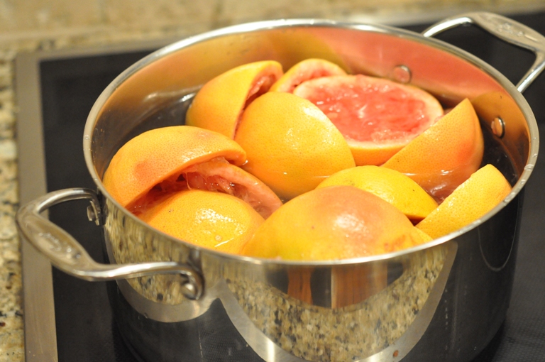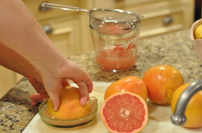 First, you’ll need to choose some beautiful citrus fruit.  I picked up half a dozen Florida grapefruits at the grocery store the other day.  Look for fruit that has a nice colour and that’s rind is free of brown marks.  Then wash the fruit, cut in half and juice.  Save the juice for another purpose.  I’m enjoying mine with a little vodka, grenadin and some sprite…tasty and sure to get you through this entire process.