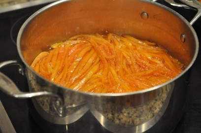 Once the grapefruits (oranges, limes, lemons or whatever you’ve selected) are juiced; put them in a large stainless steel or nonreactive saucepan and cover with cold water.  Bring to a boil on high and reduce to a lively simmer for 10 minutes.  Drain the water and repeat this process 2 or 3 times depending on the bitterness of your rind.  For the grapefruit I did it three times.
