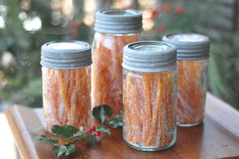 One suggestion with the candy peels ~ make sure they dry out well. If you’ve got one moist guy in the jar it will end up molding the batch. Ours lasted on the pantry shelves for a good 5 months and then started to grow some fuzz. Alternatively, you could keep them in the fridge. They’re a lot of work so you don’t want them to spoil. Let us know how you make out!