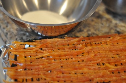 After letting it cool for about 30 minutes use a slotted spoon to remove the rinds from the syrupy mess.  Place each strip on a wire rack over a cookie sheet so the remaining syrup has some place to drip.  Then all you have to do is wait.