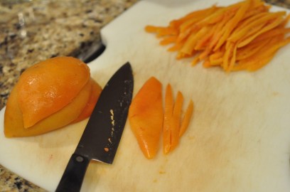 Once the flesh and pith is  removed slice the peel into thin strips… approximately 1/4″.