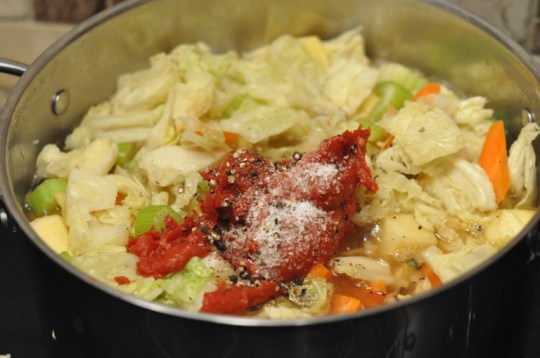 1. In a large stainless steel stockpot add cabbage, carrots, celery, turnips, and 6 cups of the stock.  Bring to a simmer, then mix in the tomato paste, 1 teaspoon salt, and some freshly ground pepper. Let it cook, uncovered, until the vegetables are very tender, for about 1 1/2 hours.