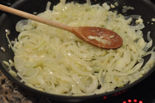 2. Meanwhile, heat the oil in a saucepan.  Once it’s hot, add the onions and sauté until tender approximately 3 to 4 minutes.  Add the garlic and sauté for an additional minute or two.  Remove from heat and set aside.