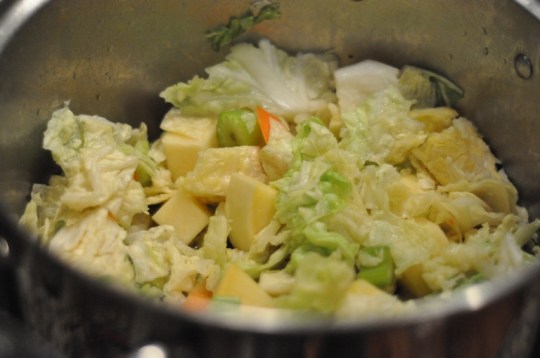 3. After the vegetables have gurgled away in the stockpot for 11/2 hours, add the onion mixture and the cubed potatoes.  Pour in the remaining 2 cups stock.  The vegetables should be submerged.  Note:  if there isn’t enough liquid to cover the vegetables, add 1 to 2 cups water to cover them.  Cook until the potatoes are just tender but not breaking up, about 30 minutes.  Season soup to taste with additional salt and pepper.