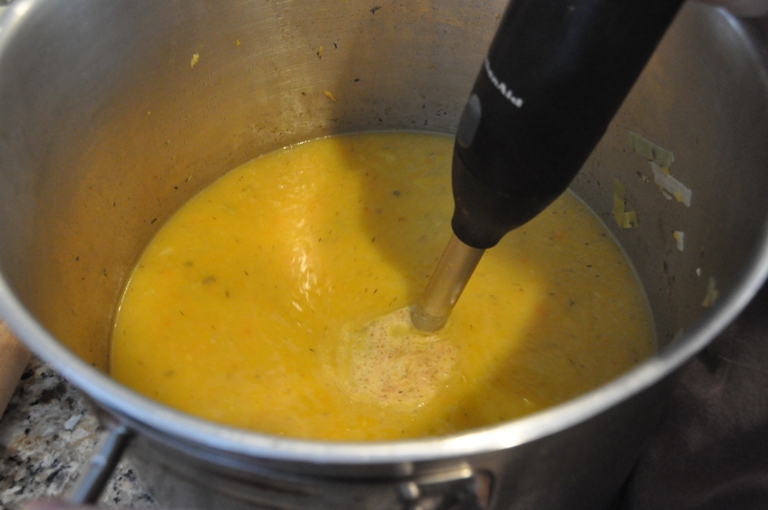 3. In the pot, purée the soup using an immersion blender until smooth and creamy.  Or, working in batches using the food processor.  We creamed our soups using both methods but we just purchased an immersion blender from Kitchen Aid…and, I’m in love.  It makes the job fun and easy with a lot less clean up.  SOLD!!  Season the soup to taste with salt and/or pepper.