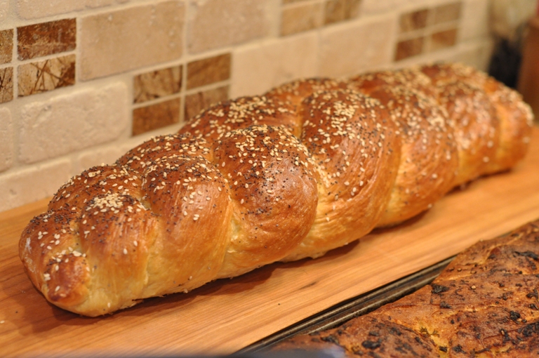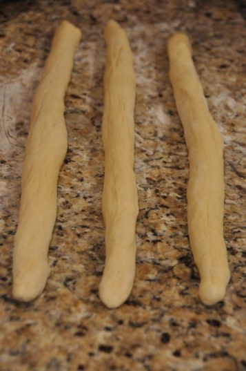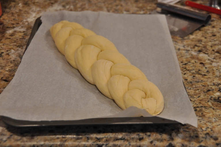 Roll out the pieces into strands about 14 inches long, thicker in the middle and slightly tapered towards the ends. Braid the strands(guys get a woman to help). I like to work from the middle towards myself and then in reverse to complete the other half(shaping methods are described in detail in the book). Transfer the braided loaf to a baking sheet lined with parchment paper. Whisk together the two egg whites until frothy. Brush the loaf with the egg whites then mist with spray oil. Cover with plastic wrap and proof at room temperature for 60-75 minutes(baking bread aint for short attention spans).