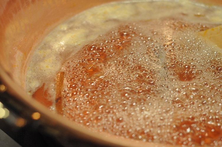 Note: we used a jelly bag for our preparation and did not press any excess juice out…we did however, end up with half of the required juice and had to do it a second time using the same amount of apples. We believe this was because we did not cover our apples when heating…3 cups 2 ounces of water was not enough. - Next day, measure 2 cups 1 ounce of the juice, leaving in the bottom of the bowl any residue that settled out overnight. You will have clearer jelly this way. Pour the apple juice, beer, sugar, orange zest, lemon juice, cinnamon sticks, and ground cardamom into the preserving pan and bring to a simmer.
