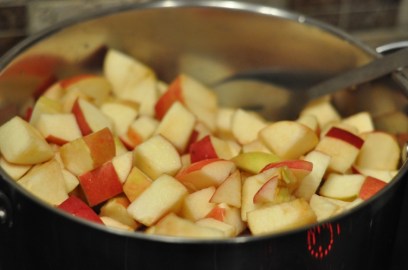 - Rinse the apples in cold water. Stem, core, and cut the apples into quarters without peeling them. (Note: we did not core the apples)