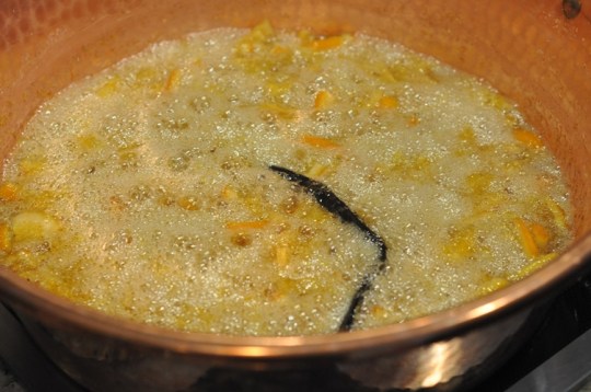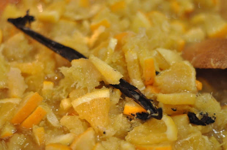 5. When the marmalade is finished skim the foam (if any), remove and discard the vanilla pod, and pour into hot sterilized jars, leaving 1/4″ headspace, wipe rim, add lids and rings and process in a hot water bath for 10 minutes.