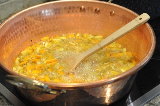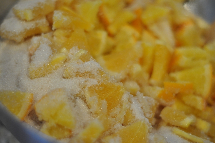 2. In a mixing bowl combine orange eighths, sugar and orange juice.  Mix together.  Transfer the mixture to an 11- or 12 quart copper preserving pan or a non-reactive saucepan.