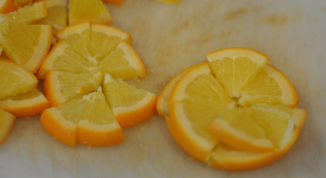 • 2 pounds sweet oranges, thinly sliced and cut into eighths (we used navels) ~ 1 1/2 pounds came from the orange flavoured vodka and the additional 1/2 pound we added.