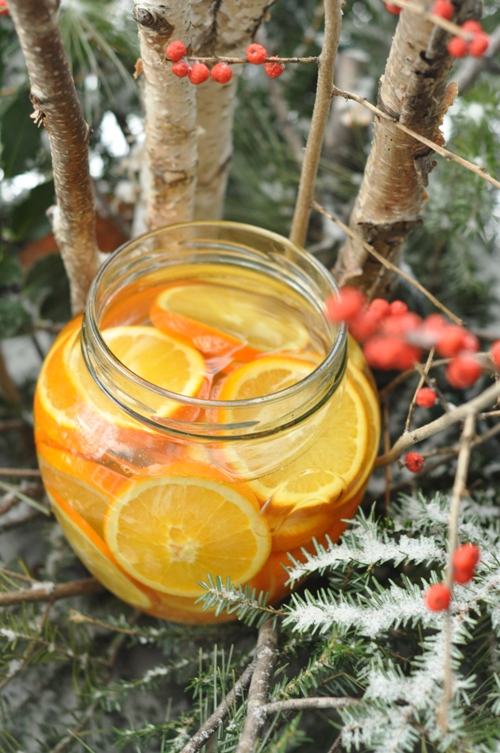 1. Pour the vodka into a clean mason 1.5mL mason jar (or any large jar) with a tight-fitting lid.  Wash the oranges and slice them into 1/4″ rounds and submerge them in the vodka.  Store in a cool, dark place for 2 weeks, shaking it once a day.