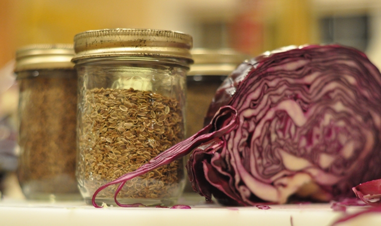 Okay, we know you guys are going to think we’re crazy and “how much sauerkraut can two people eat?” but we just can’t stop making the stuff!  We know it seems ridiculous to have crock after crock fermenting on our kitchen counter but people we are addicted to the mystery of it all!  And, our friends love us for it!  Each batch behaves differently…it’s an experiment each and every time.  You never know if it will co-operate to create enough liquid, will it bubble up to let you know it’s working, and all the different, tangy flavours… like this batch with the seeds…How will we know what we like the best if we don’t try them all!?!