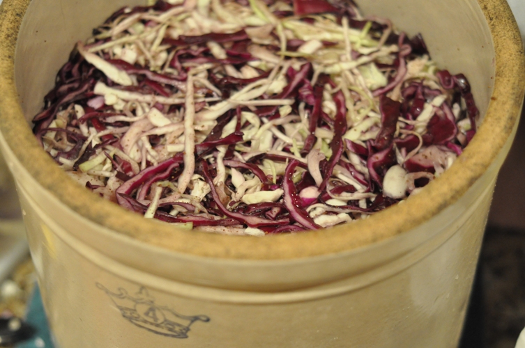 Now, the above recipe outlines what we did (because we ended up adding some salt).  However, you can do this without any salt at all…just add 1 cup of  water to create the liquid/brine that covers the cabbage.  And, be sure to use fresh cabbage or you may not get enough liquid.