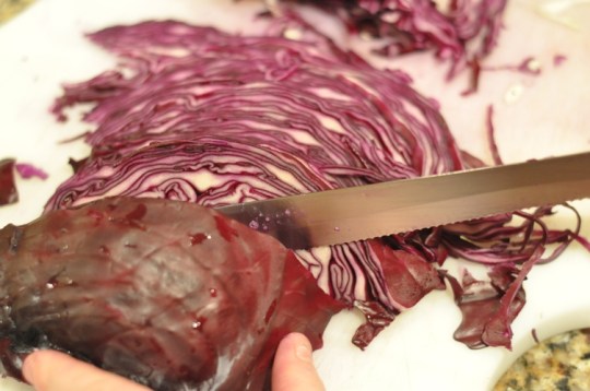 2. Using a serated knife (like a bread knife) cut the cabbage head in half, remove and discard the heart.  Cut each half into very thin strips and place in a large bowl.  Note: you can do this in a food processor but we like doing it by hand ~ a little bit more control on the finished product).
