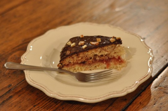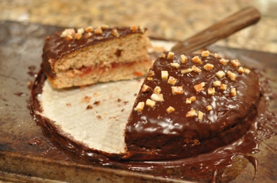 Allow the cake to cool for at least 45 mins. Remove the springform pan (you may need to run a knife around the edge to loosen the cake). Next cut the cake in half, creating two thinner circles. Spoon on your marmalade, smoothing out to cover the bottom cake layer. Replace the top layer.