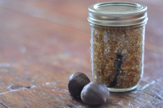 The chunky texture may have something to do with the freshness of the chestnuts or this may just be the nature of the nut.  But, like so many recipes with few components, the success or failure comes down to selecting the freshest ingredients and putting them up as soon as you get them.  I suspect these chestnuts sat around the store for a month longer than they should have.  Even as I was shelling them I found several that were spoiled.