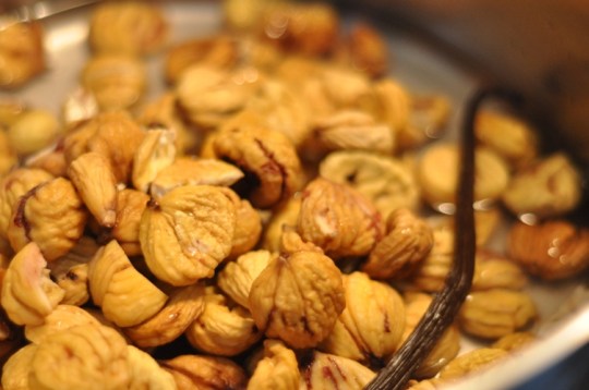 2. In a preserving pan, combine the chestnuts, sugar, water, and vanilla bean, split lengthwise.  Bring to a boil and then reduce heat to cook for about 15 minutes, stirring gently.  The chestnuts will be soft.  Pour the mixture into a ceramic bowl.  Cover with a sheet of parchment paper and refrigerate overnight.